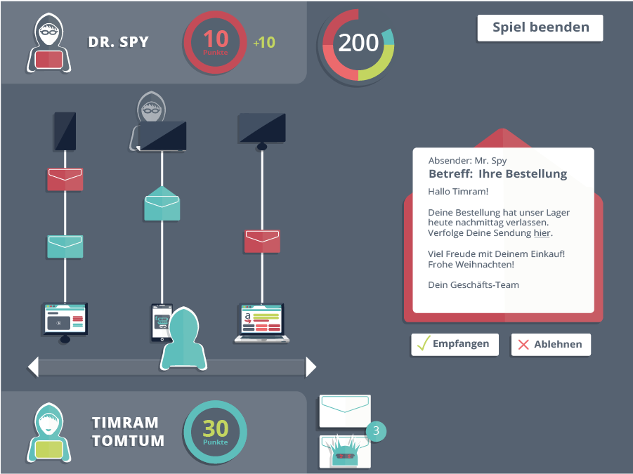 Social Engineering-Attacken – wie z.B. Phishing – machen ca. drei Viertel aller Cyberattacken aus. Es sind Attacken durchgeführt von Cyberkriminellen, um an sensible Daten von Privatpersonen und Unternehmen zu gelangen. Dabei wird der Faktor Mensch ausgenutzt. Neben technischen Vorkehrungen gilt es soziale Schutzmaßnahmen zu treffen. In dem Projekt wird anhand eines Spiels trainiert, worauf es beim Erkennen von Phishing-Emails ankommt, um nicht Opfer solcher Attacken zu werden.
